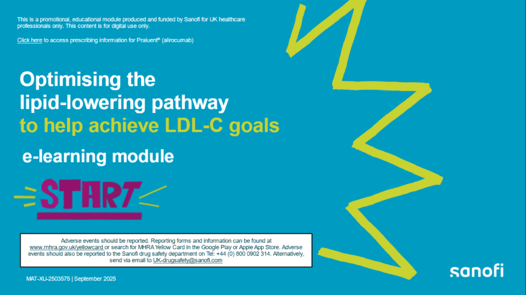 In this CPD-accredited, interactive e-learning module we’ll explore the key principles of lipid management, including current guidelines, LDL-C targets and pharmacological treatment options. We’ll also examine a novel, patient-centred lipid-lowering pathway developed by Morecambe Bay NHS Trust, which uses a distance-to-goal approach to guide timely, appropriate escalation of treatment based on individual patient profiles and lipid targets.