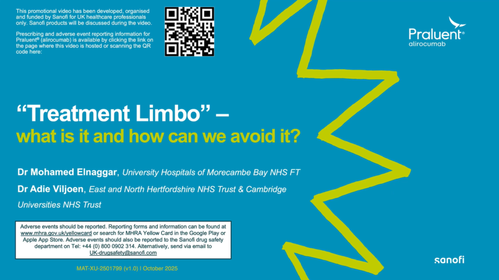 In this short video, Dr Adie Viljoen and Dr Mohamed Elnaggar explore the challenge of “Treatment Limbo,” where patients with dyslipidaemia fail to achieve LDL-C targets yet remain ineligible for advanced therapies. They introduce a guideline-aligned, alternative approach that tailors treatment to baseline LDL-C and distance to goal, supporting timely intervention and helping to reduce the risk of recurrent cardiovascular events.